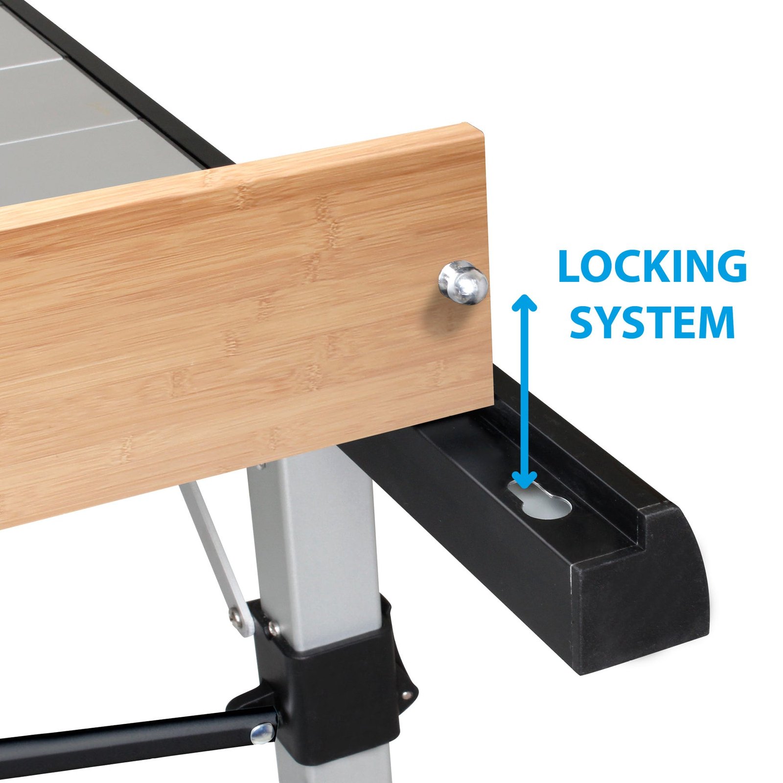 Новата гама алуминиеви маси Quadra с подвижен плот разполага с изцяло нова сгъваема рамка, която се основава на класическата конструкция на масата с 4 вертикални крака. Плотът на тази маса за къмпинг без процепи е свързан към рамката на масата със специален механизъм за бързо заключване. За разлика от класическите сгъваеми маси с x-образна рамка, Quadra предлага достатъчно свободно пространство за краката от всичките 4 страни. Лесна и бърза настройка. Модерен дизайн, съчетан с подобрена функционалност.Моделът TROPIC плот с крайни ламели, изработени от истинско бамбуково дърво и интегриран нивелир за перфектна работа на новата система за регулиране на нивелиране на 90°.
