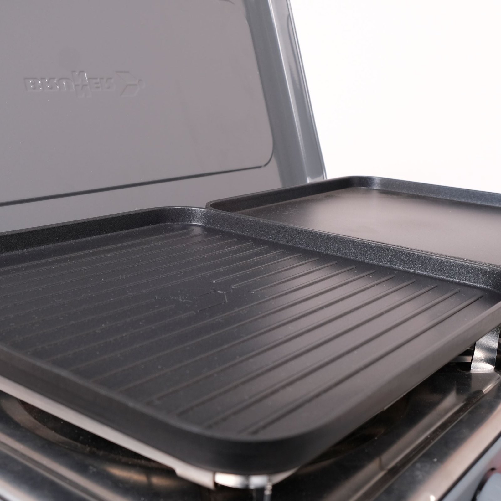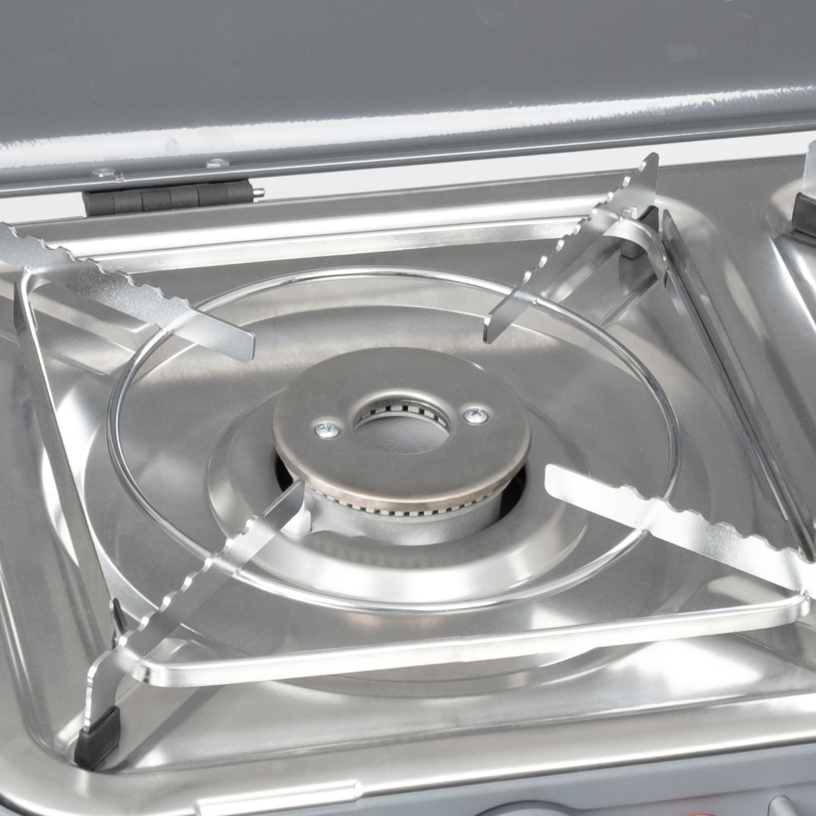 Преносим двоен газов грил котлон с две зони на готвене и две плочи. От серията на BRUNNER DEVIL KOOKMASTER с ненадмината производителност. четири здрави високи крака и удобен рафт, този газов котлон се превръща в незаменима кухня която пренася професионалното готвене навсякъде с вас. Devil Kookmaster от италианската марка Brunner идва с две грил плочи, гладка и оребрена плоча за скара. Разгледайте всички наши газови барбекюта.