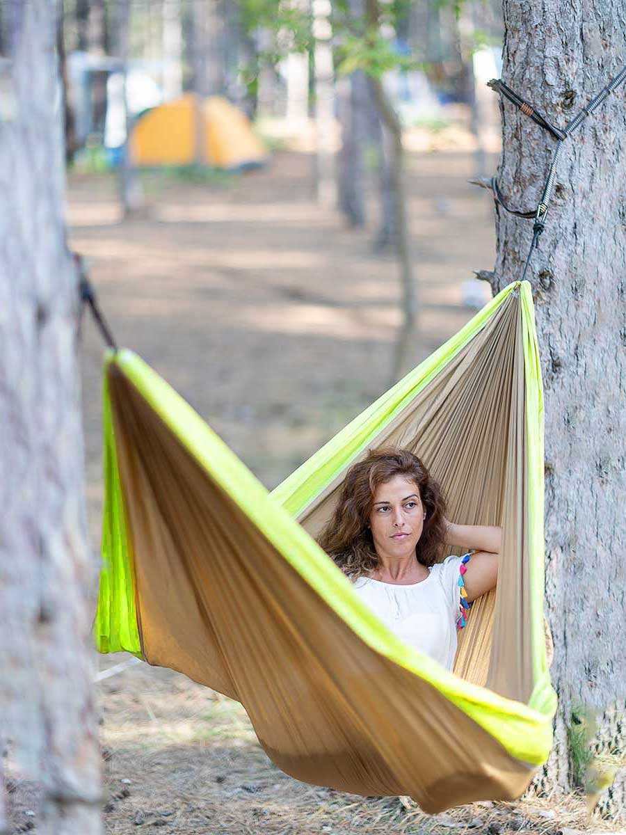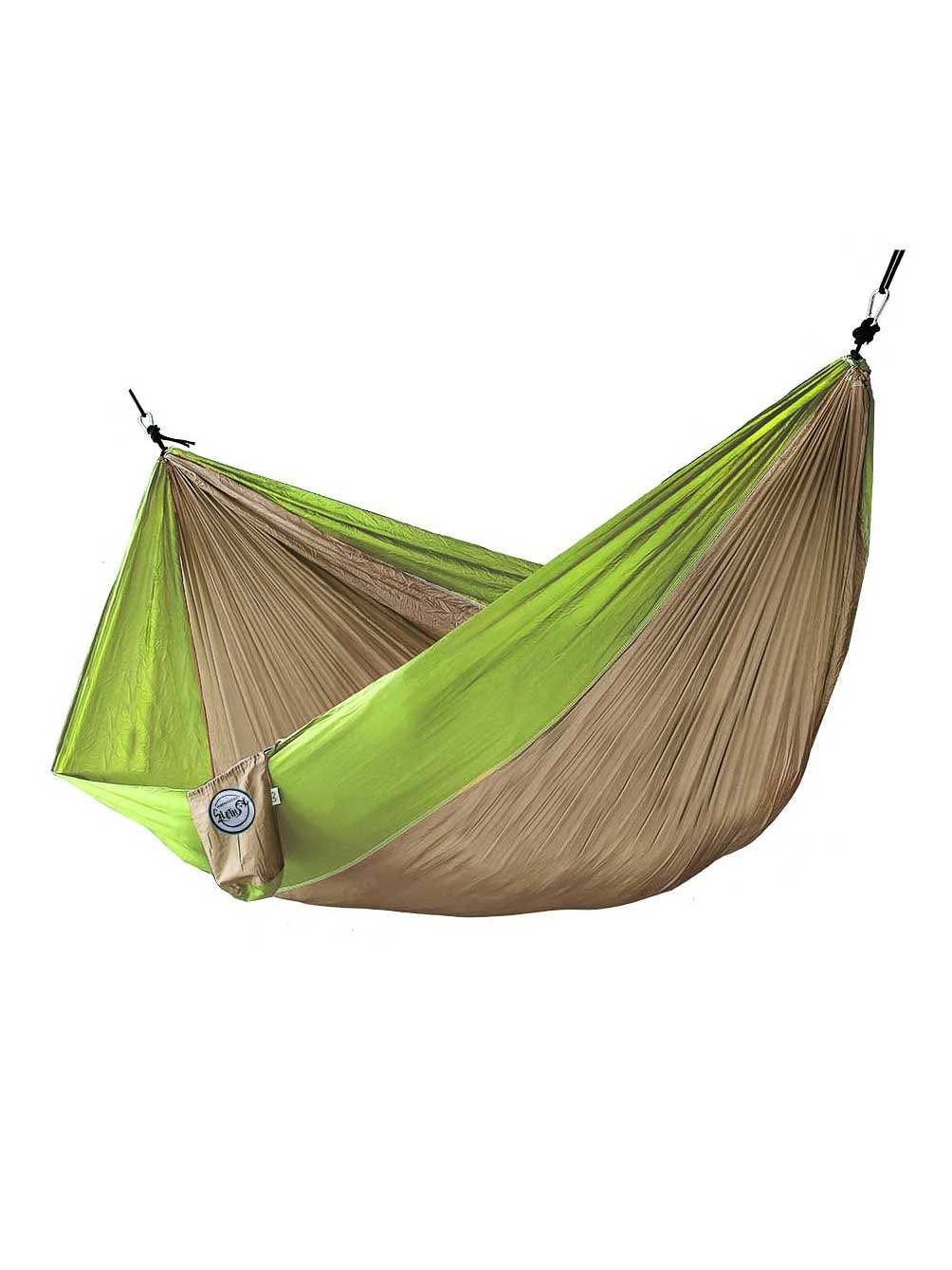 Много лек двоен хамак от парашутна коприна, който можете да вземете навсякъде с вас. Изключително лек, не заема много място в багажа ви.