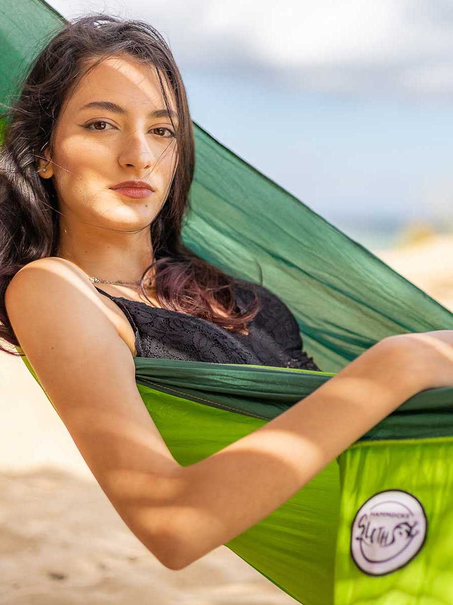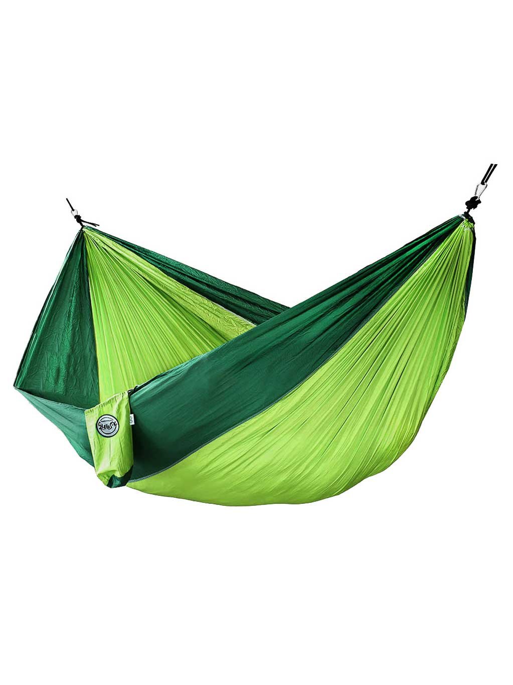 Много лек единичен хамак от парашутна коприна, който можете да вземете навсякъде с вас. Изключително лек, не заема много място в багажа ви.