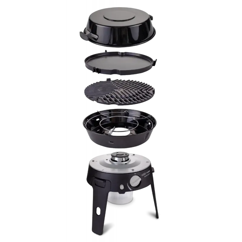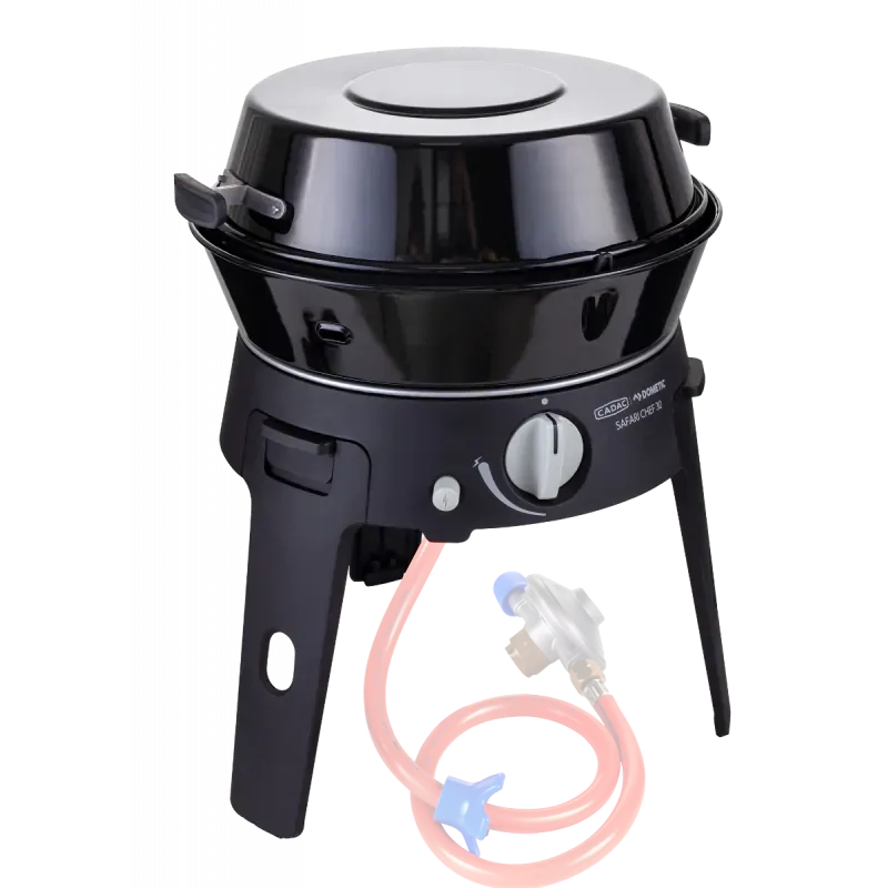 Преносимо и компактно 4-в-1 газово барбекю за къмпинг и път CADAC Safari Chef 30 LP Deluxe. Сгъваемо и практично налично в два варианта с директна връзка за газова бутилка или пълнител EN417