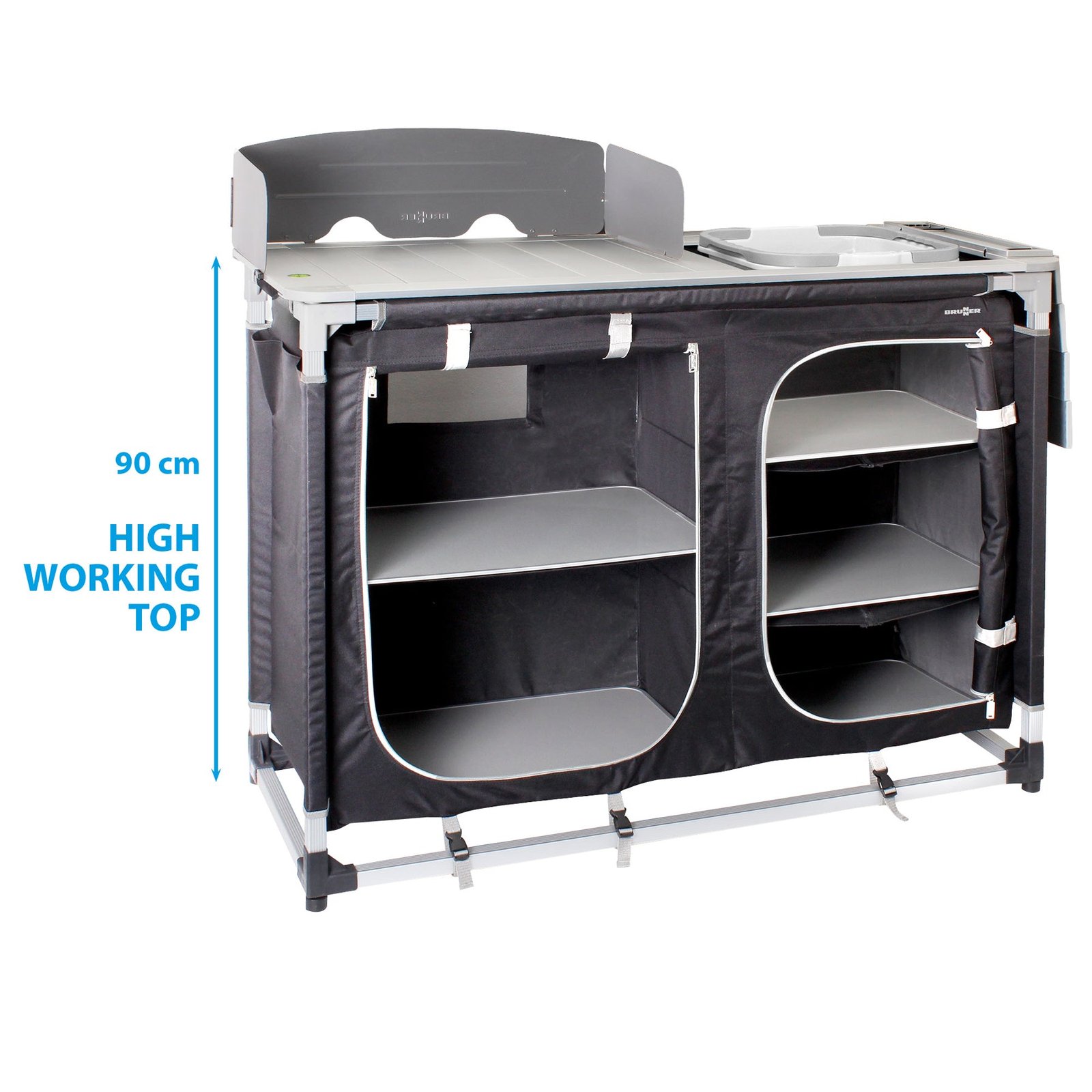 Преносима кухня за къмпинг от марката BRUNNER с интегрирана, сгъваема мивка и 2 големи отделения за съхранение с много място за храна и прибори за готвене. С голям алуминиев ролков плот и нивелиращи крака. Голям размер и изключително стабилен дизайн благодарение на използването на здрави правоъгълни профили. Лесно и бързо сглобяване. Работна височина: 90см. Комплекта включва гръб за завет защита срещу вятър и пръски, както и удобна чанта за носене.Характеристика:• Рамка: Алуминий• Текстил: 100% полиестерна тъкан с ПВЦ покритие• Отделения за съхранение: 2 отделни отделения за съхранение с цип (5 рафта)