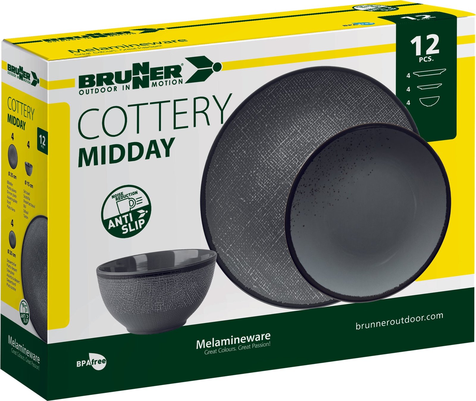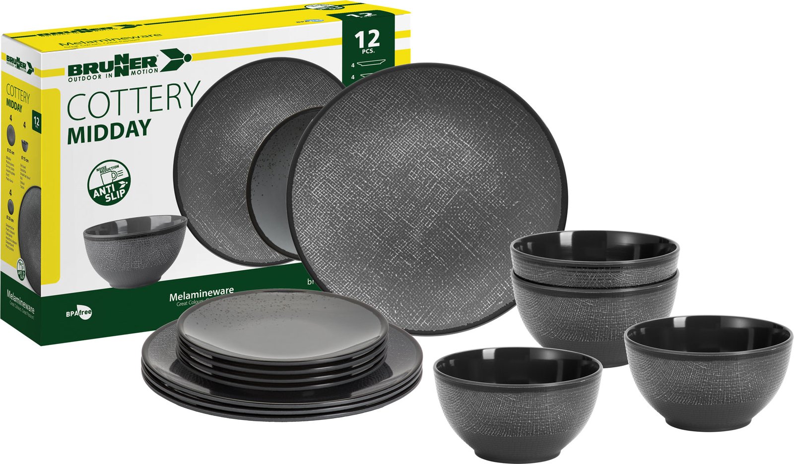 Сервиз за хранене нечупливи чинии от меламин. Предназначен за употреба на открито за къмпинг, караваниа и кемпери. BRUNNER COTTERY 12. е идеален за къмпингуване със семейството или приятели. Изработен от издръжлив меламинов материал, този комплект включва 4 чинии за хранене, 4 дълбоки чинии, 4 странични чинии, всички в модерен цвят. Направете следващото си хранене на открито стилно и безпроблемно изживяване. Отлични съдове за хранене. Разгледайте нашите съдове и прибори за къмпинг.