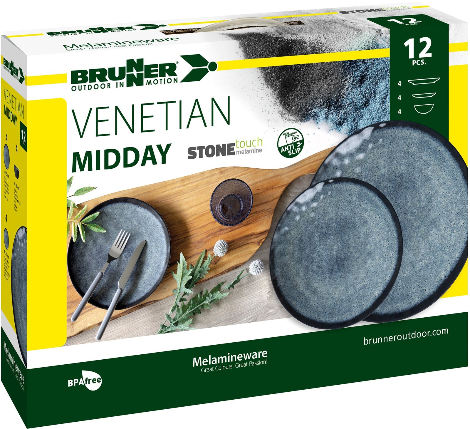Сервиз за хранене нечупливи чинии от меламин. Предназначен за употреба на открито, за къмпинг, караваниа и кемпери. BRUNNER VENETIAN 12. е идеален за къмпингуване със семейството или приятели. Изработен от издръжлив меламинов материал, този комплект включва 4 чинии за хранене, 4 дълбоки чинии, 4 странични чинии, всички в модерен цвят. Направете следващото си хранене на открито стилно и безпроблемно изживяване. Отлични съдове за хранене. Разгледайте нашите съдове и прибори за къмпинг.