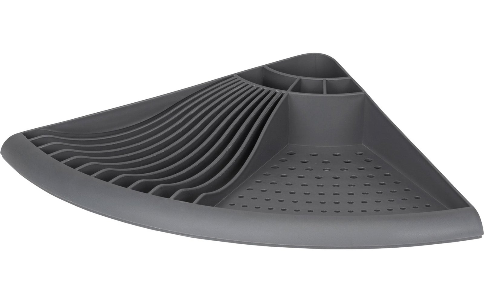 Ъглов отцедник за съдове, разделен на 2 секции. Идеален за използване в ограничени пространства в караваната или кемпера.Изработен от издръжлив термопластичен материал.