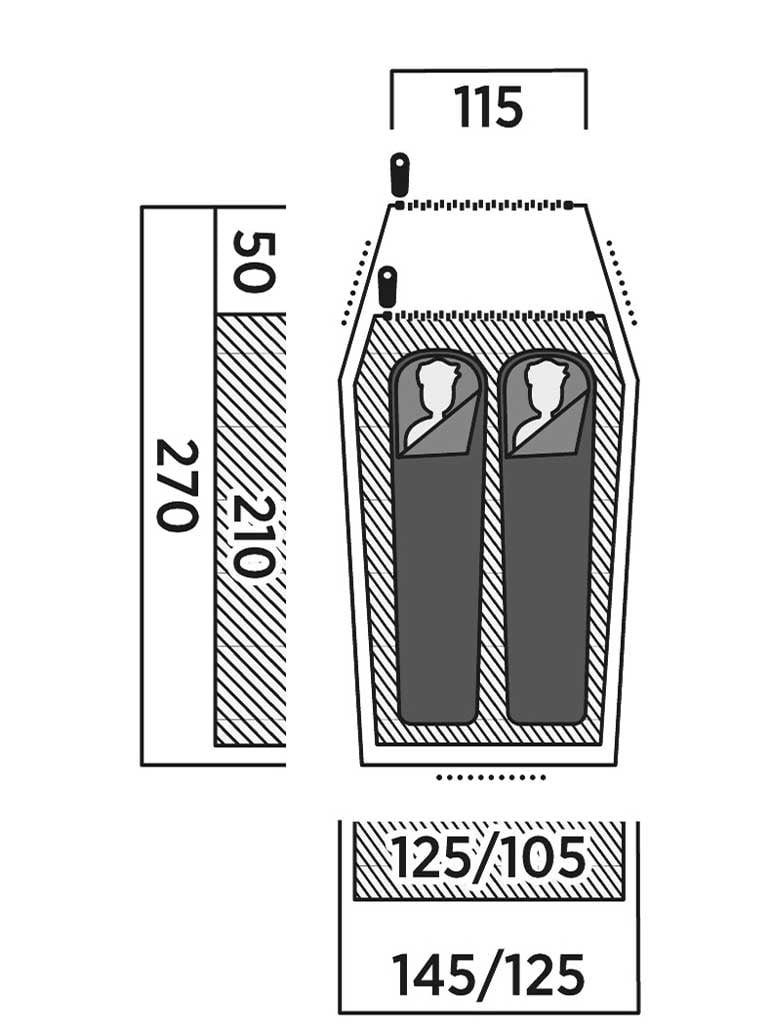 • Размери на палатката: 270 х 145 х 100/75 см (Д х Ш х В)