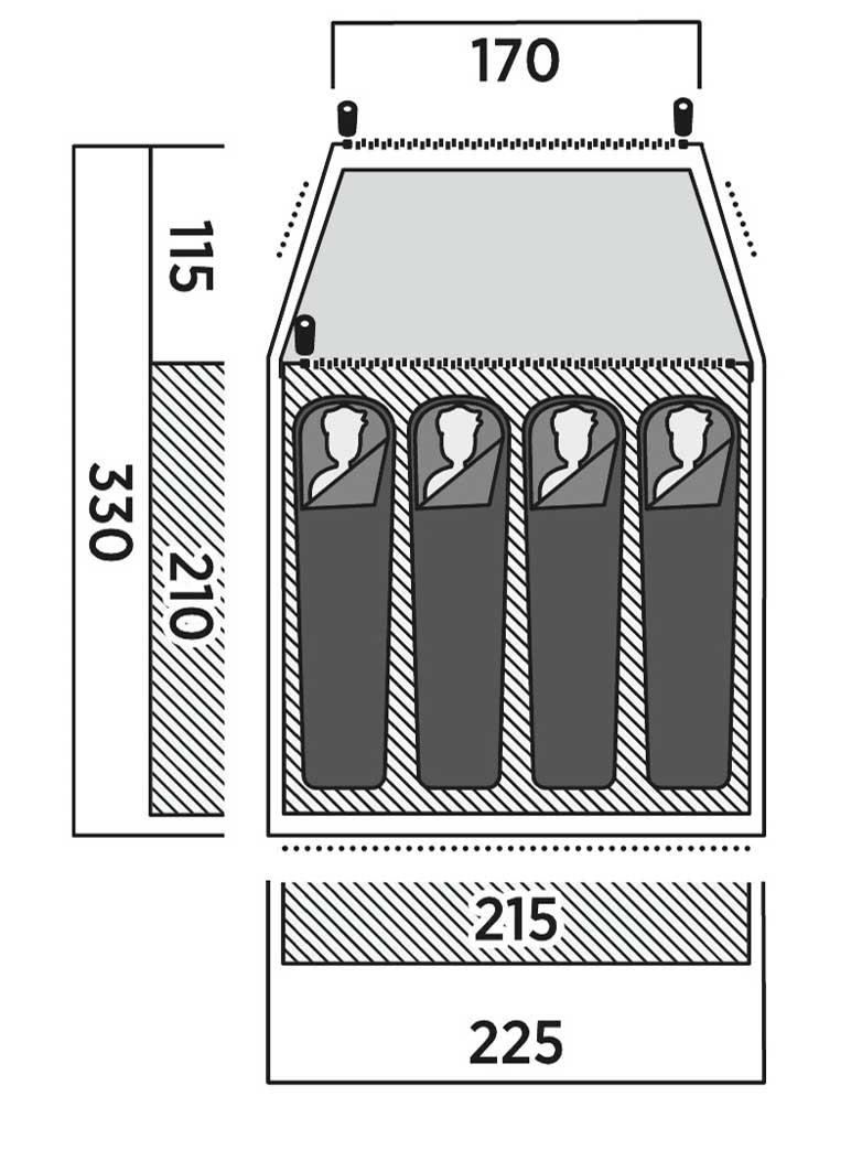 • Размери на палатката: 330 х 225 х 130 см (Д х Ш х В)