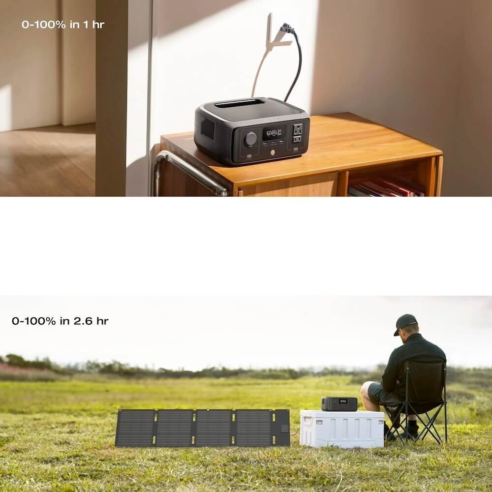 - С четири универсални опции за зареждане сме се погрижили да зареждате RIVER 3 почти навсякъде, където се намирате. Зареждайте с помощта на променливотоков контакт за ултрабързо 1-часово зареждане, зареждайте в движение със зарядно за автомобил и работете извън мрежата или екологично с бързо слънчево зареждане до 110W. RIVER 3 има изцяло нова опция за зареждане – през генератор. Включете се и зареждайте удобно навсякъде, където има контакт.