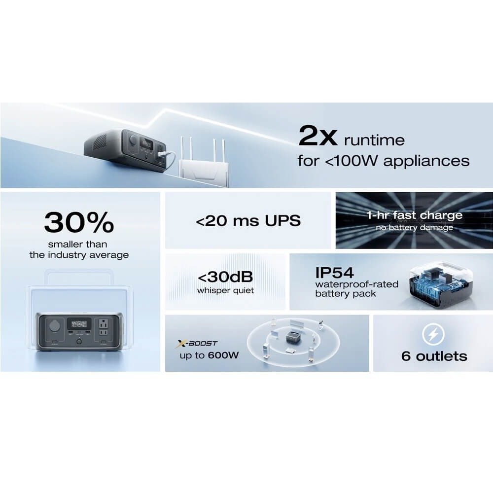 - Вграден UPS – когато възникне прекъсване на захранването, вашият AC контакт ще превключи към захранването на RIVER 3 за едва забележими 20 ms. Той поддържа работата на жизненоважни домашни уреди, поддържа съхранение на храна, сигурност и комуникация. Изпитайте безпроблемно, автоматично превключване за непрекъснато спокойствие.