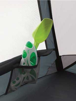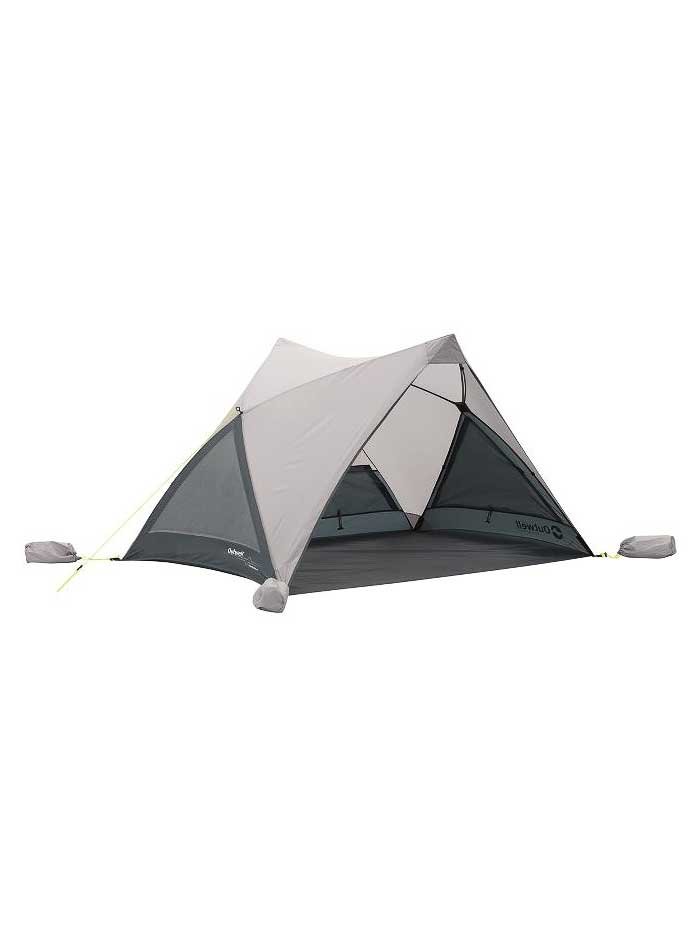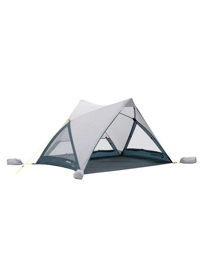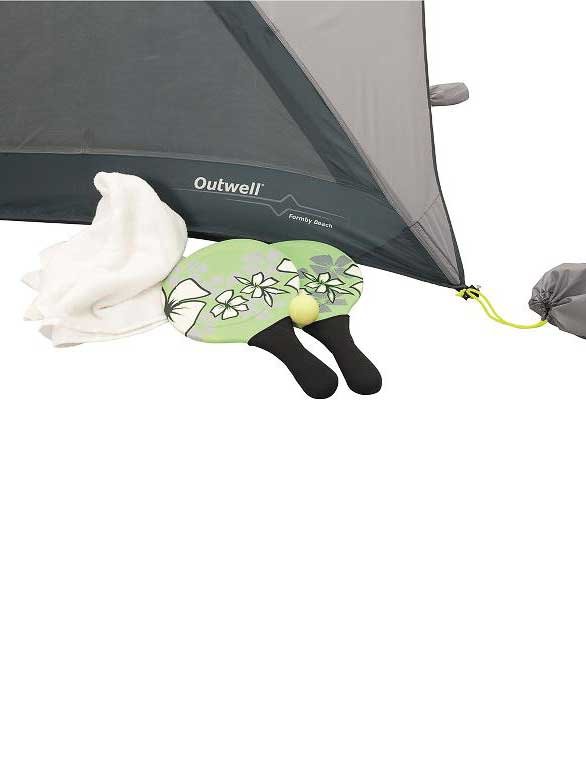 Тента за плаж, осигуряваща защита от слънце и вятър. Със зашит под, мрежести прозорци, завеси и вътрешна височина до върха от 120 см, това е много практичен вариант за семейства с малки деца. Тентата е предназначена за временна употреба като кратки къмпинги, градини през уикенда и спортни събития и не трябва да се използват като постоянно или дългосрочно решение за подслон.