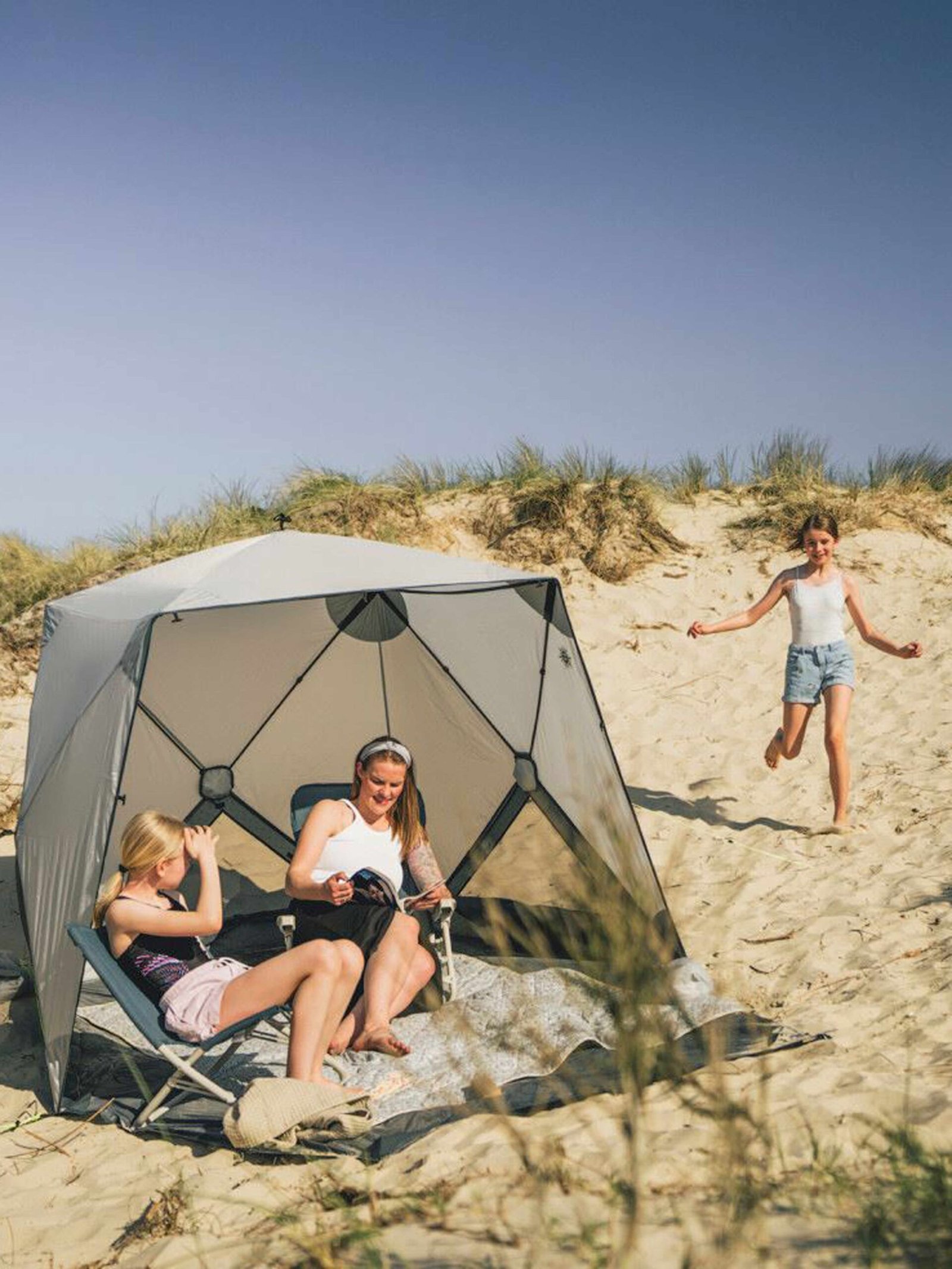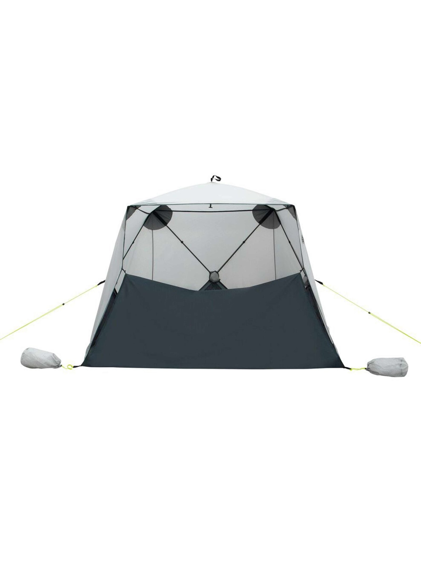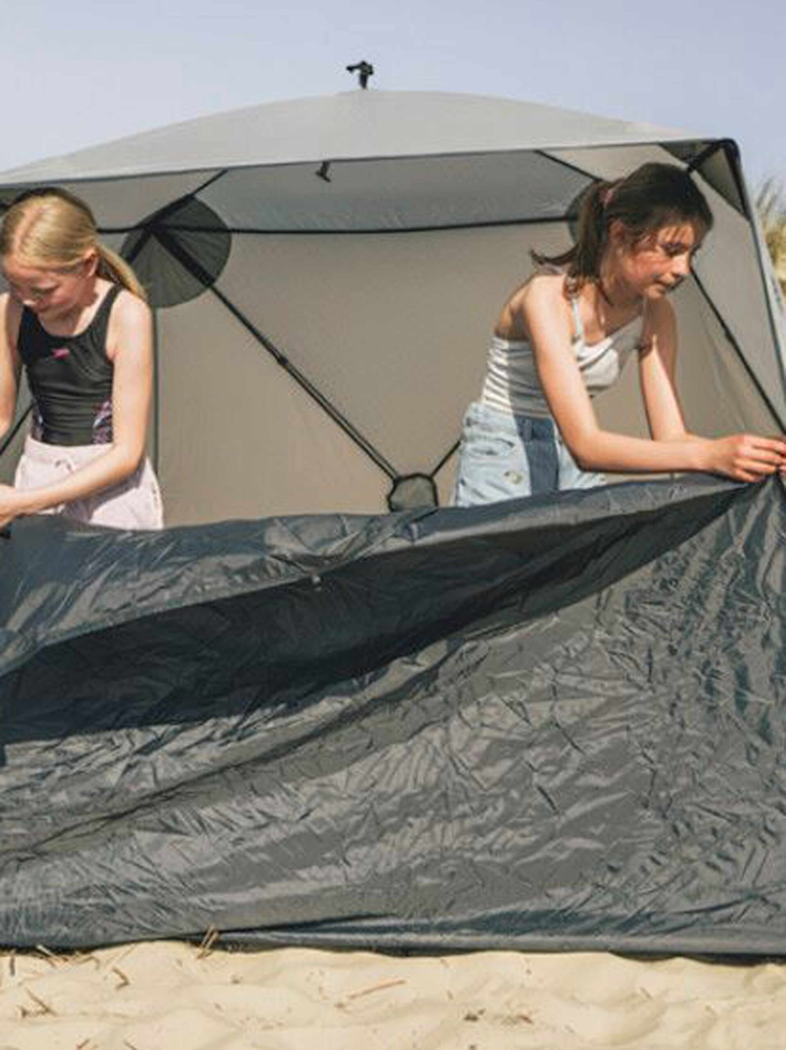 Прекарайте безпроблемни дни на плажа с тази лесна за поставяне плажна тента, благодарение на системата Rapid-pitch Lite с предварително свързано горно покривало и рейки. Удължението на пода служи и като удобна „врата“ за допълнителен подслон. За допълнителна стабилност напълнете ъгловите джобове с пясък. Мрежестите джобове осигуряват място за съхранение на малки предмети, а големите вентилационни панели осигуряват оптимален въздушен поток. Освен това, палатката включва пластмасови колчета за пясък за сигурно поставяне върху рохкава земя.