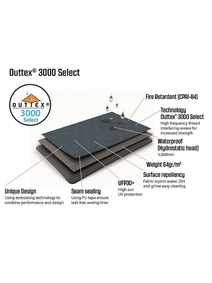 • Външната част на палатката е изработена от Outtex® 3000 (100% полиестер) с воден стълб от 3000 мм