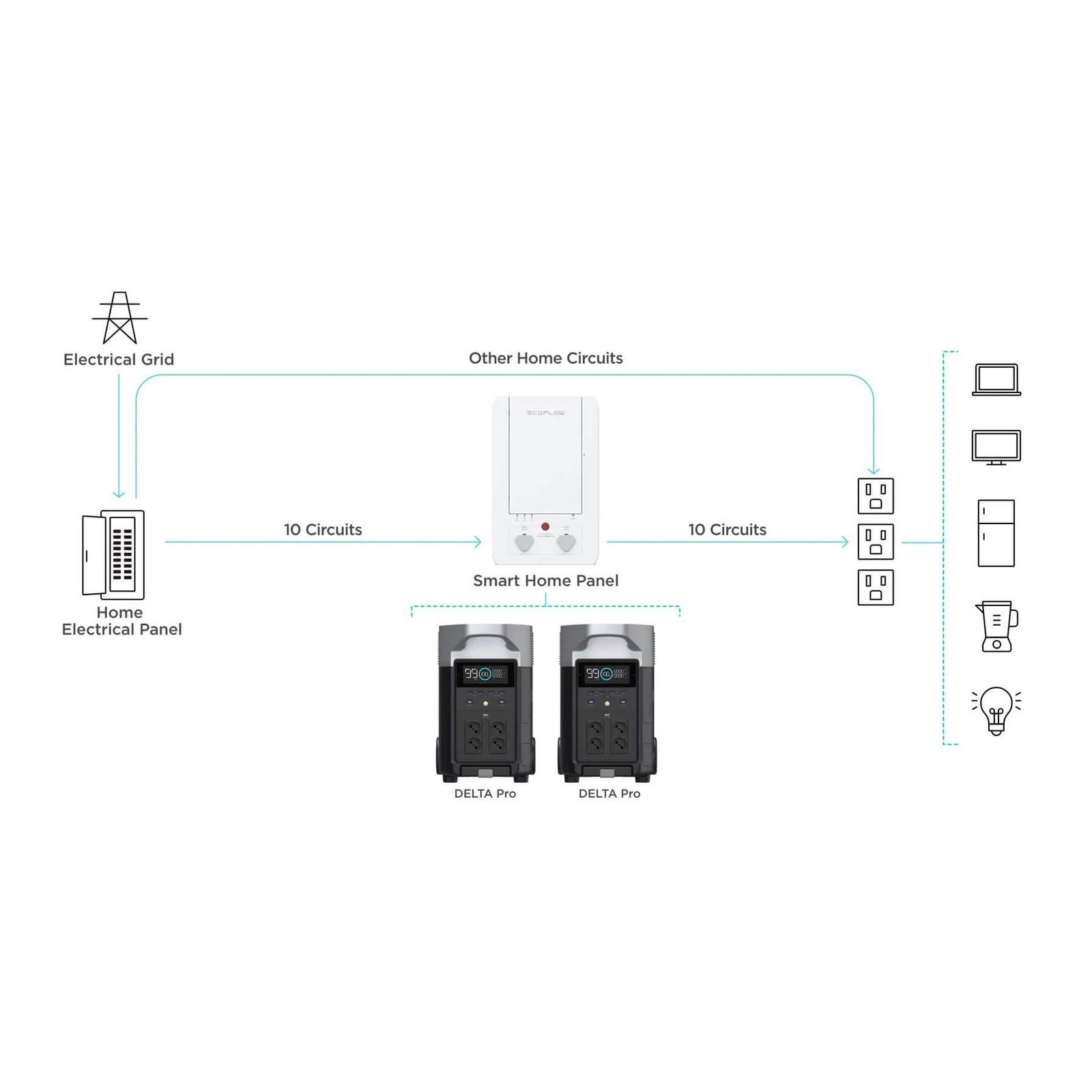 • Новият интелигентен EcoFlow mart Home Panel (НЕ е включен в комплекта) е сърцето на екосистемата от домашни батерии DELTA Pro. Той интегрира до две устройства DELTA Pro с до 10 домашни вериги. Всеки DELTA Pro може да бъде свързан с допълнителни батерии, слънчеви панели или интелигентни генератори, което ви осигурява непрекъснато захранване по време на прекъсвания на електрозахранването, интелигентно управление на енергията за вашите критични товари и по-ниски сметки за енергия